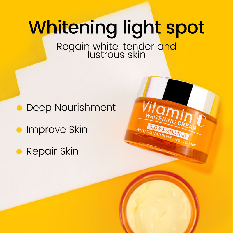 ビタミンCフェイスクリーム :このクリームは、美白成分と複数の植物エキスが豊富に含まれており、べたつくことなくリフレッシュし、深く栄養を与え、ダメージを受けた肌を改善・修復し、穏やかに美白し、しわ、シミ、ニキビ跡を安全かつ効果的に修正し、色素沈着を防ぎ、毛穴を最小限に抑え、肌を長時間明るく、弾力があり、潤いのある状態に保ちます。